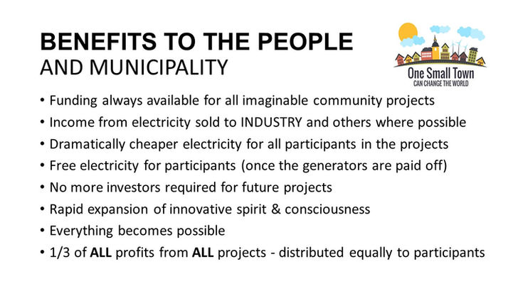 Successful businesses, currently in the town, are encouraged to help support the One Small Town initiative by investing in other project/business plans that help achieve the town’s self-sustainable goals and generate a profit for the investor.